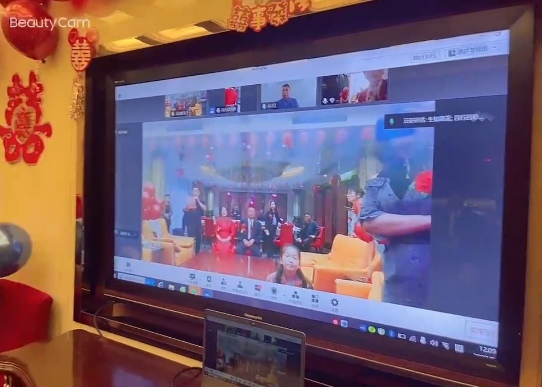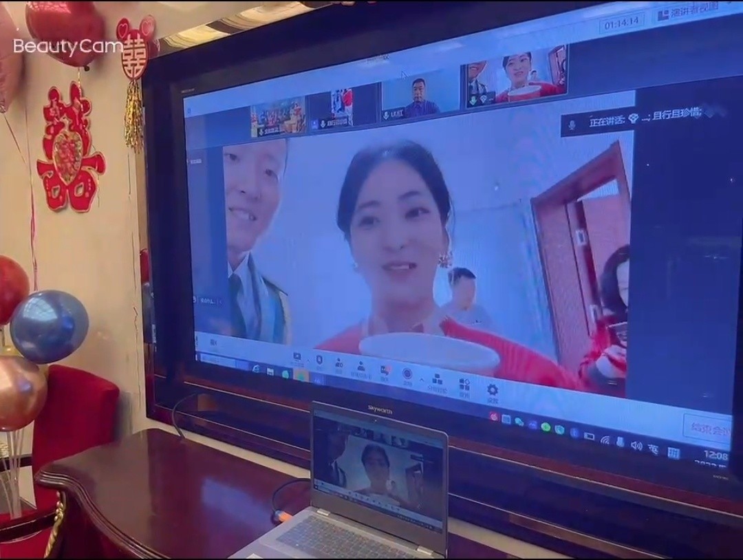 然而受疫情影响,二人的婚礼面临再次延期举办的无奈。在和父母商量后,他们决定婚礼如期举行。为贯彻落实国家疫情防控要求,双方父母不能到婚礼现场见证,于是在河北秦皇岛、北京、山东菏泽三地开设了婚礼分会场。通过网上视频会议的方式,双方父母在线上“隔空”见证这对新人步入婚姻的殿堂,异地同时共饮喜酒,共同为这对新人送上新婚祝福。
