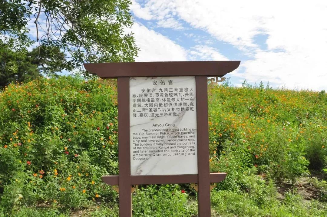 门内是第二道围墙形成的大院。北边汉白玉雕砌的高台上,巍然矗立着一座九楹的高大的殿堂,这就是安佑宫。安佑宫面阔44.4 米,进深20.1 米,是圆明园内最壮丽的殿堂。宽大的汉白玉石基,朱红色的门柱,非常壮观。重檐歇山带屋脊的屋顶覆盖黄色琉璃瓦,在阳光下光彩熠熠。殿前的月台上安置有鼎炉五座,铜鹿、铜鹤各一对,殿前两侧再配以碑亭、配殿,加之周围郁郁葱葱高大挺拔的苍松翠柏、浓荫蔽日,气氛庄严肃穆。殿中供奉着康熙、雍正的遗像。乾隆、嘉庆、道光死后,也被供奉在这里。