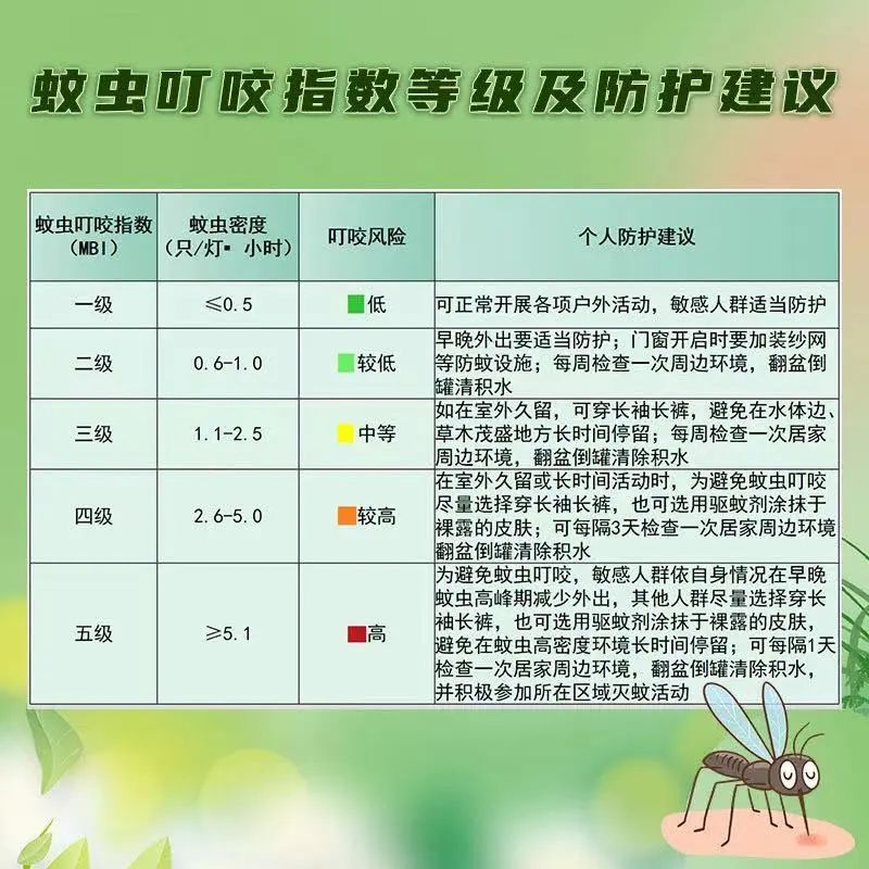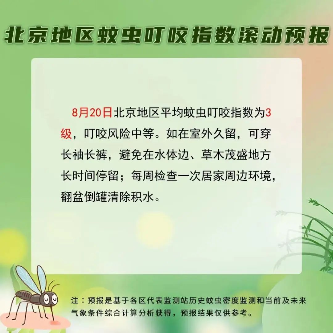 当前,北京蚊虫叮咬指数为三级,中等风险。预防蚊虫传播的疾病,关键在于控制蚊虫滋生和加强个人防护。北京地区常见蚊虫种类为淡色库蚊和白纹伊蚊(俗称“花蚊子”)。
