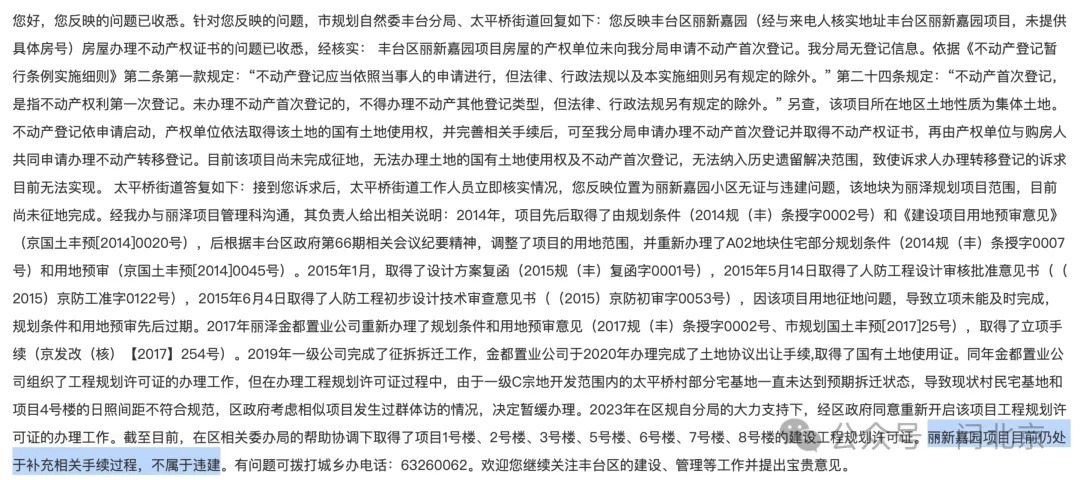 “问北京”记者查询发现,今年3月,属地太平桥街道办曾在“领导留言板”回复居民,经与丽泽项目管理科沟通,其负责人给出相关说明:2023年在区规自分局的支持下,经区政府同意重新开启丽新嘉园项目工程规划许可证的办理工作。截至目前,在区相关委办局的帮助协调下取得了项目1-3号楼、5-8号楼建设工程规划许可证。丽新嘉园项目目前仍处补充相关手续过程,不属于违建。
