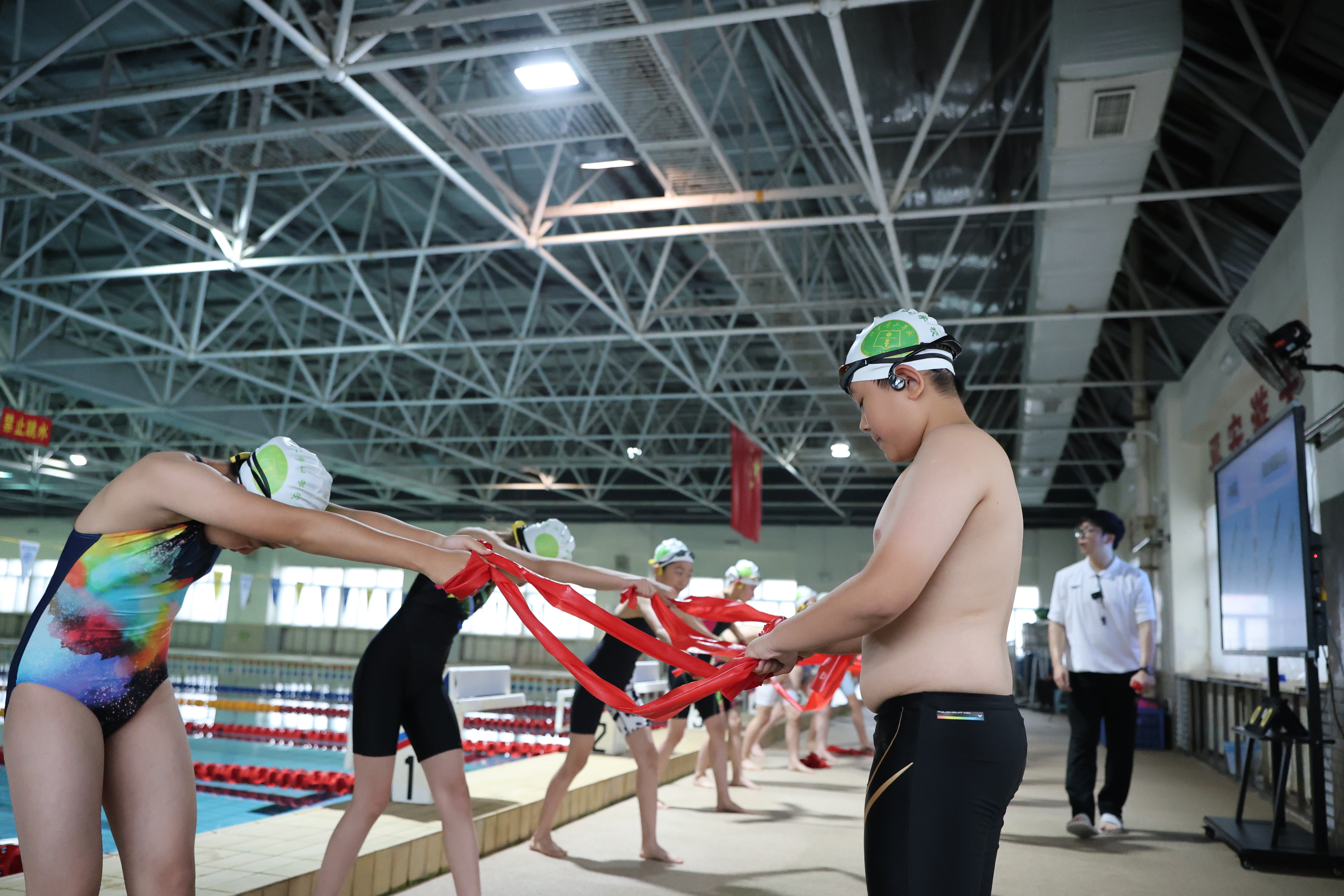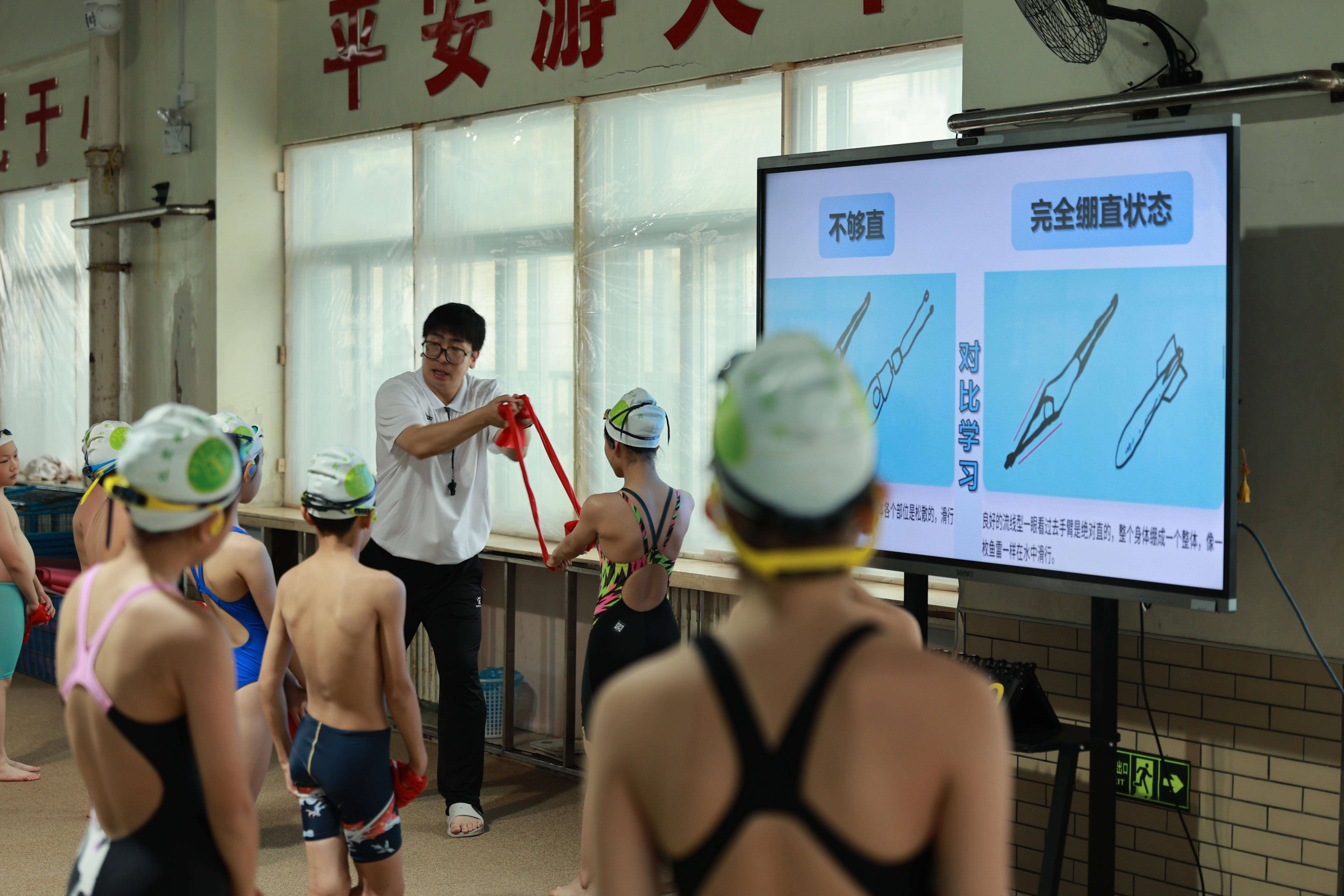 游泳馆内,一场别开生面的蛙泳课正在进行。学生们佩戴智能设备跃入池中,而池边的AI系统正通过水下摄像机实时捕捉动作细节。“该同学腿部收分连贯性不足,蹬夹力度可进一步提升。”AI系统在学生完成动作后即刻生成分析报告。体育教师申松阳介绍,这项技术使个性化指导更加精准,“如同为每个孩子配备了智能教练”。