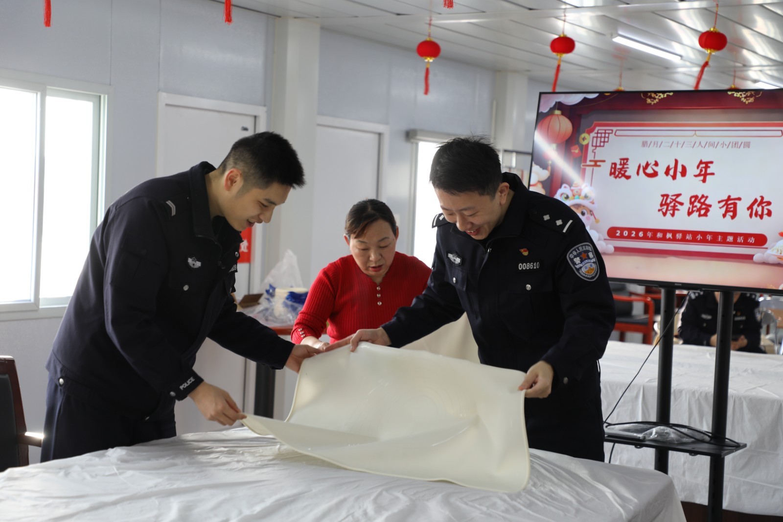 活动中,红灯高挂添喜气,窗花映福满庭芳,民警与货车司机师傅们携手装扮驿站,挂灯笼、贴窗花,大红福字与中国结相映生辉,驿站里温馨喜庆、暖意融融,处处透着家的温暖与年的祥和。和面、擀皮、包馅、塑形,大家围桌而坐,指尖起落间,一个个饱满圆润的饺子整齐排列,裹进的是烟火寻常,包满的是诚挚祝福。