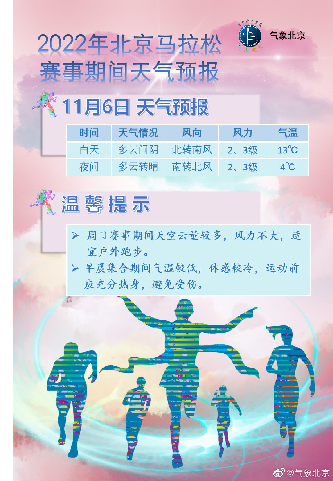 周日(6日)气温较低,体感阴冷,需注意防寒保暖,北马赛事前参赛人员应充分热身,避免受伤。