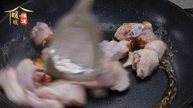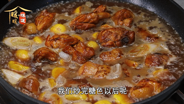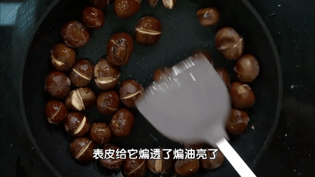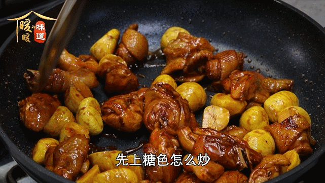 翻炒:锅中放少量油来炒白糖,炒至起翻花后倒入鸡块翻炒上色,再马上下入板栗煸炒。