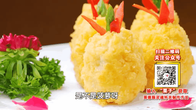 然后再将板栗球先裹层淀粉、再裹层蛋液,接着裹上馒头碎攥成“菠萝”的形状。
