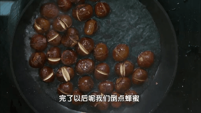 焖制:锅中加入适量清水,让水稍微没过板栗的二分之一处,然后加入蜂蜜调味,待大火烧开后盖上锅盖焖8分钟。