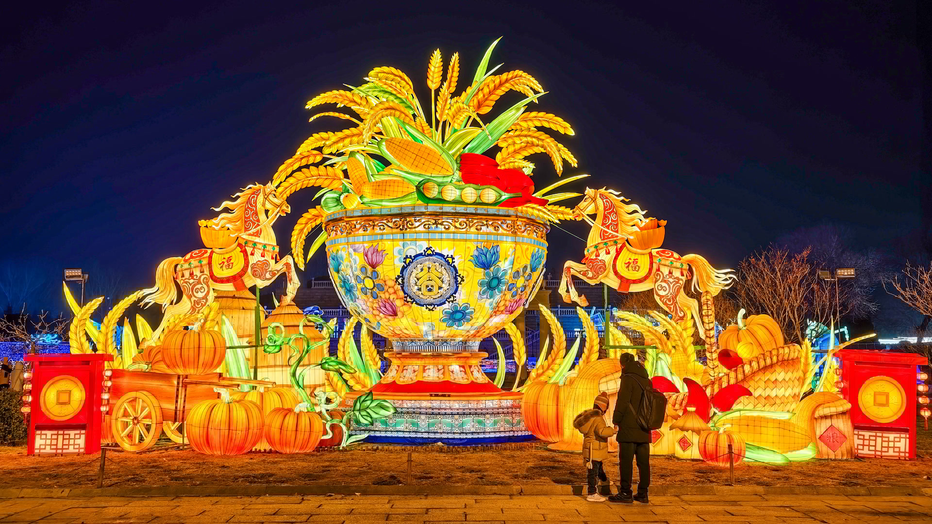 场景焕新,最为直观。记者在世界公园东门外广场看到,高达12米的“福照万邦 结缘天下”灯组成为全场视觉焦点,融合祥云、中国结等传统元素,象征着团圆美满、同心汇聚。来到内广场,7米高的“五谷丰登”灯组,以金黄麦穗、饱满南瓜等农作物造型,搭配传统年画风格福娃形象,传递着丰收喜悦与富足期盼。南门入口处,9米高的“京彩女神”灯组,身着华丽传统服饰,细节处尽显非遗技艺的传承与创新。