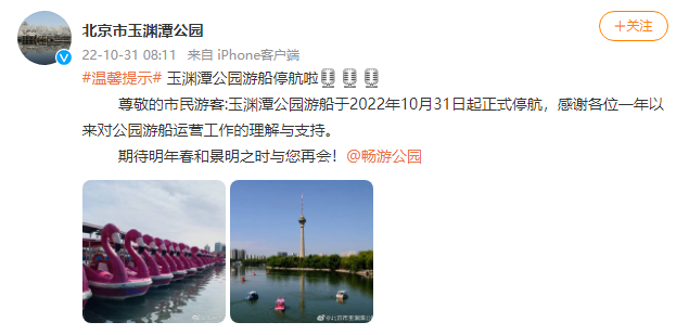 玉渊潭公园今日发布:公园游船于2022年10月31日起正式停航,感谢各位一年以来对公园游船运营工作的理解与支持。