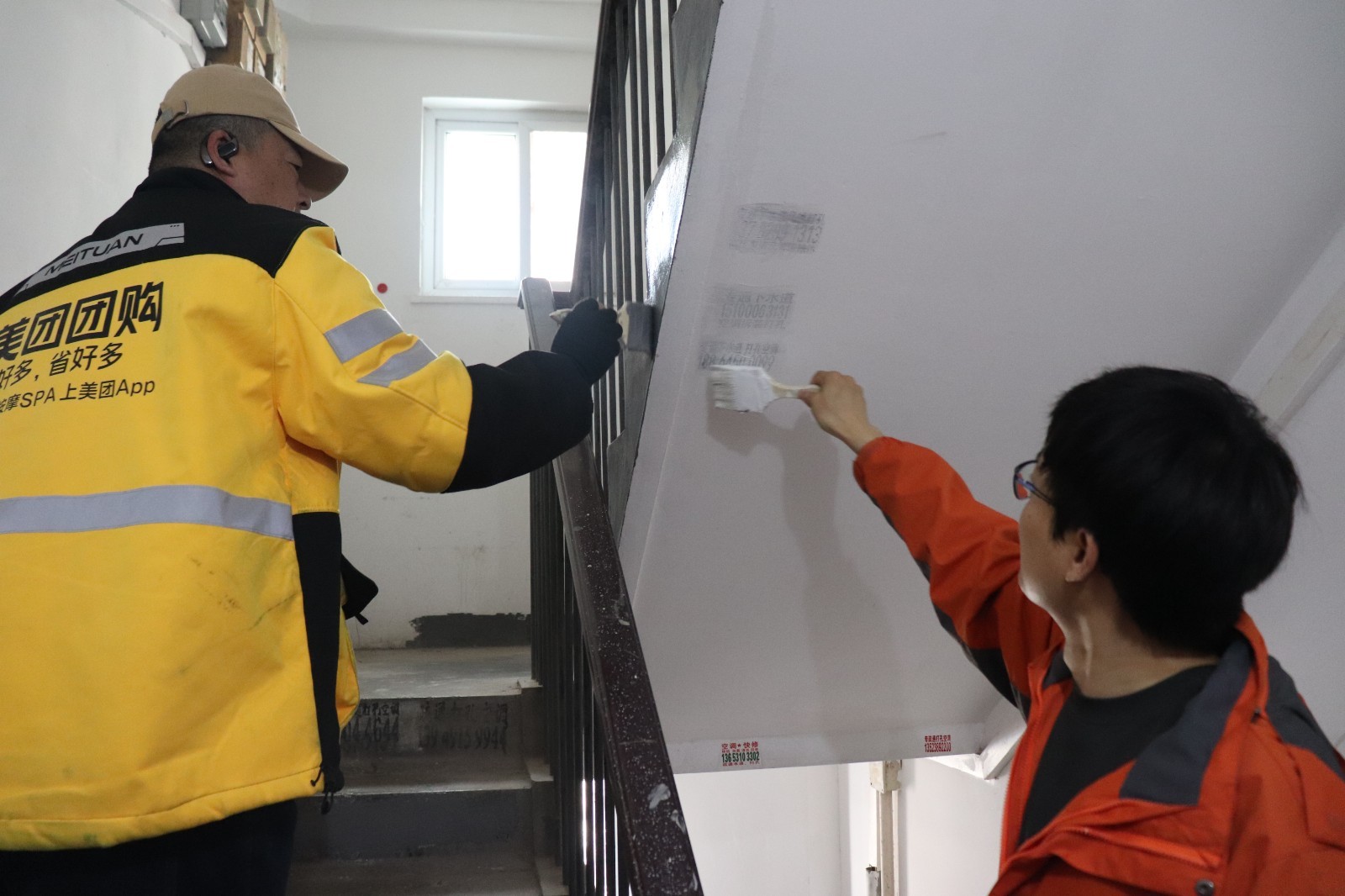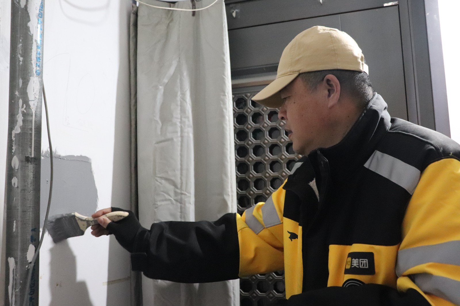 除了晨练归来的居民、赶着上班的年轻人,楼前还多了几位熟悉的“陌生人”——他们身穿不同颜色的工服,手里拿的不是快递包裹,而是刮板、刷子和油漆。美团外卖员刘春光、京东快递员徐晓军、中通快递员张宇凡,这三位平日里在朝外大街小巷穿梭的配送者,暂停接单,干了一件“漂亮事”!
