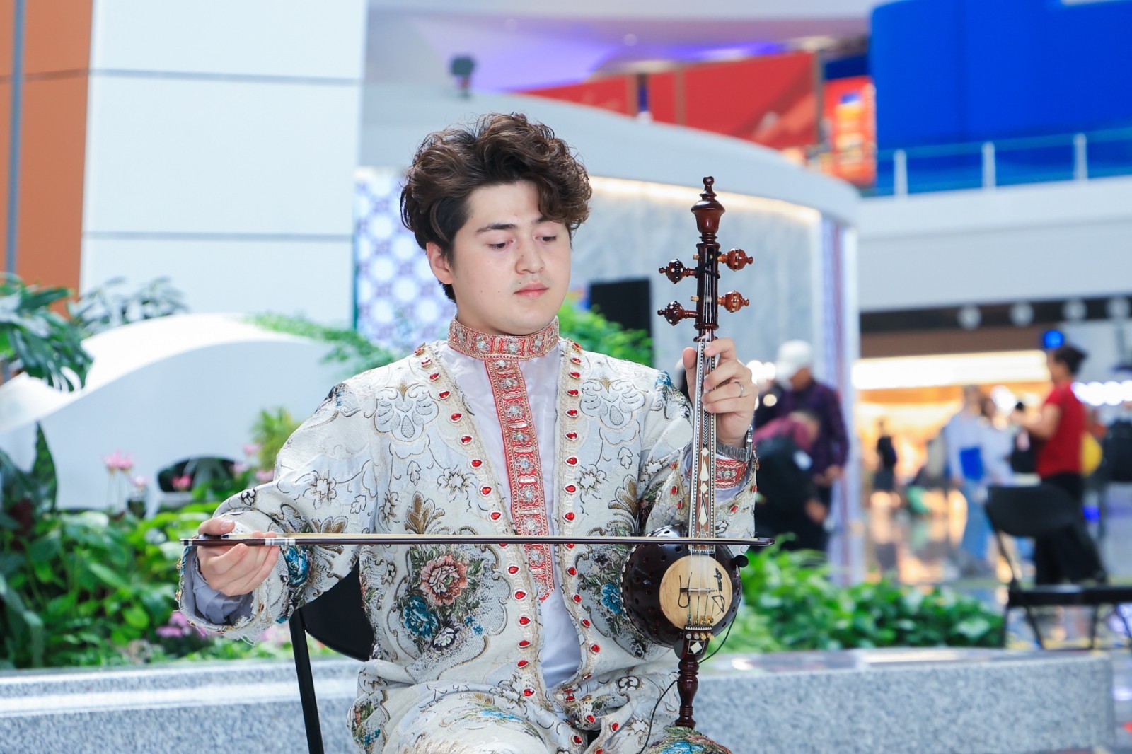 本场演出于航站楼国内候机区音乐花园、瓷园展开,汇聚中国鼓、独弦琴、艾捷克、马头琴等民族代表性乐器:中国鼓独奏《龙腾虎跃》,以磅礴鼓点震撼开场,激荡豪迈气象;京族独弦琴《雨林晨曲》,一弦流转,漾出水墨般的温婉意境;维吾尔族艾捷克《吉尔拉》,灵动跳跃,演绎别样风情;蒙古族马头琴《万马奔腾》 琴声苍茫,勾勒草原辽阔画卷;终曲《爱无疆》 以马头琴与独弦琴合璧,诠释跨越地域的情感交融。在演出现场,旅客或驻足静赏,或举机记录,匆忙旅途因文化浸润而更显从容。