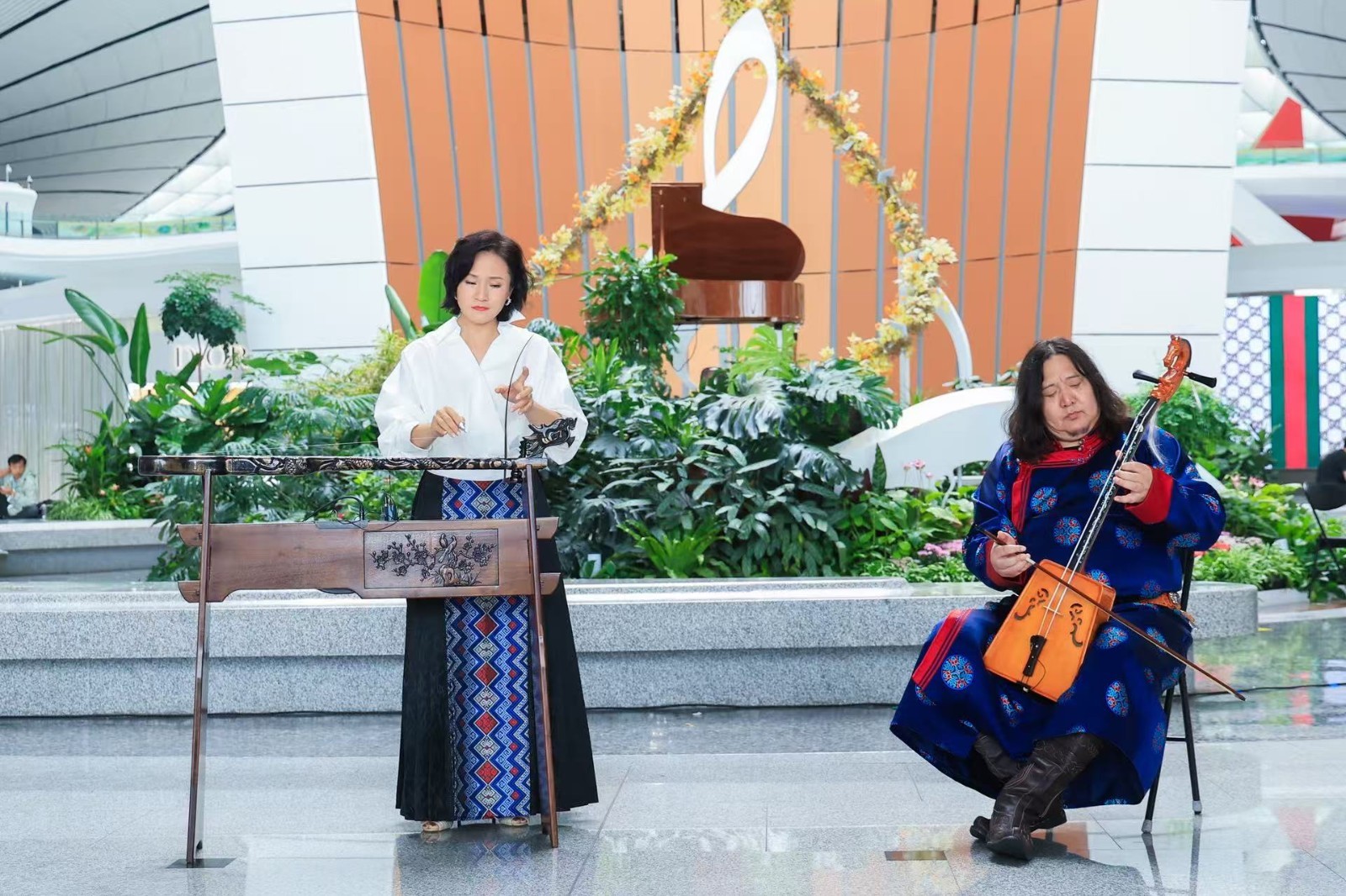 8月15日,北京大兴国际机场航站楼内民族乐声悠扬,暑期音乐节第五场——民乐专场温情启幕。源自不同民族的代表性乐器为旅客候机时光注入浓厚的民族文化韵味。