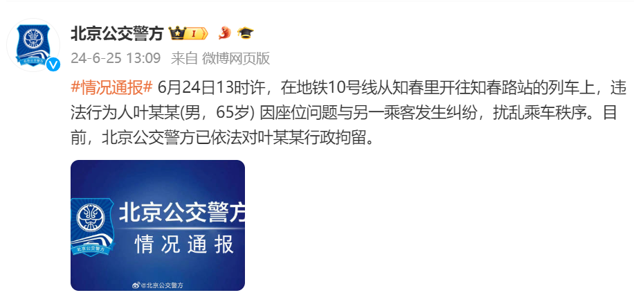 据北京公交警方 通报,6月24日13时许,在地铁10号线从知春里开往知春路站的列车上,违法行为人叶某某(男,65岁) 因座位问题与另一乘客发生纠纷,扰乱乘车秩序。目前,北京公交警方已依法对叶某某行政拘留。