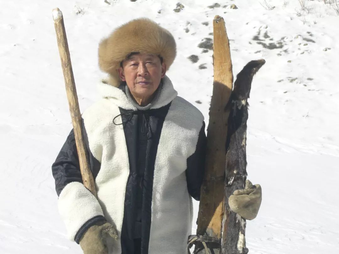 (单兆鉴在新疆阿勒泰体验古老毛皮滑雪板)