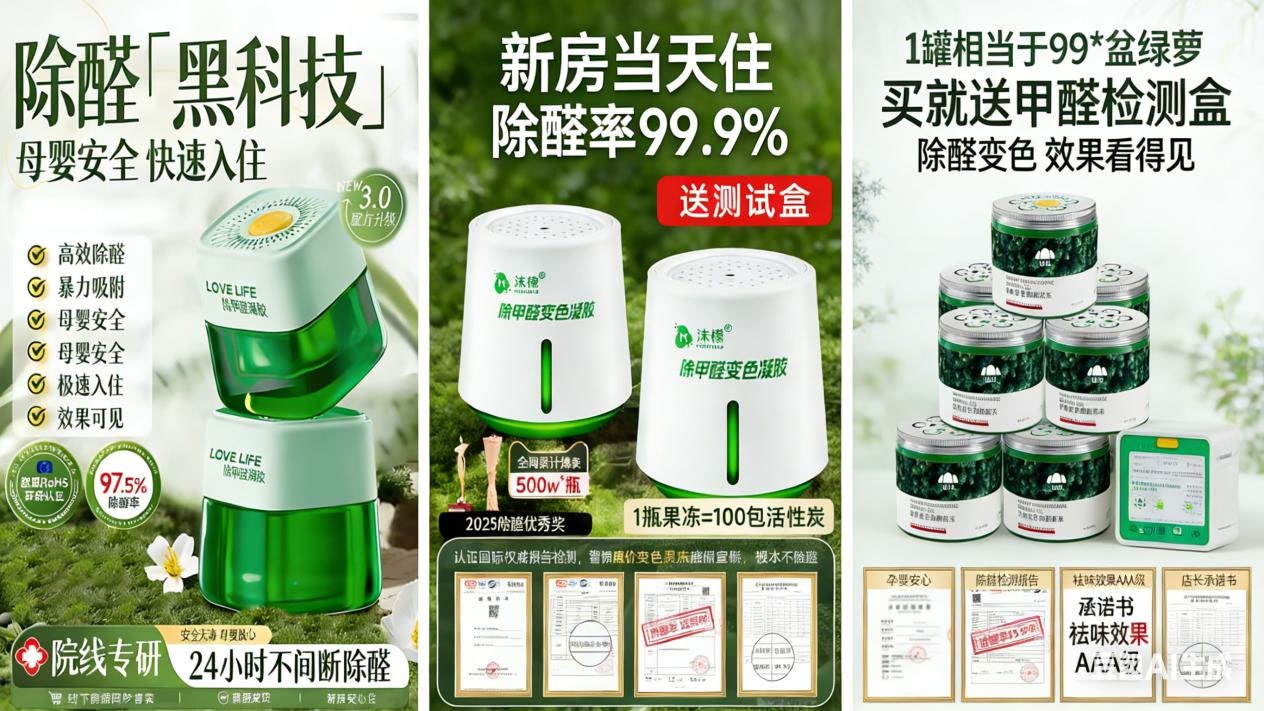 除醛果冻也存在类似问题。商家宣称“24小时搬新家”“除醛率99%”,如刻意淡化实验空间体积、特定温湿度的前提,普通家庭环境下效果存疑。部分产品以“果冻变色反映除醛进度”为噱头,实则是利用视觉错觉欺骗消费者;有的用“草本精华”模糊核心成分,未告知强氧化性可能引发的呼吸道刺激、物品腐蚀等风险。