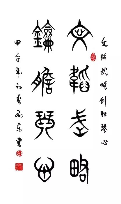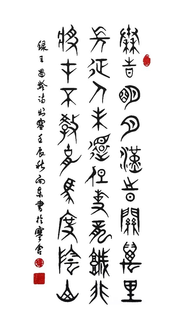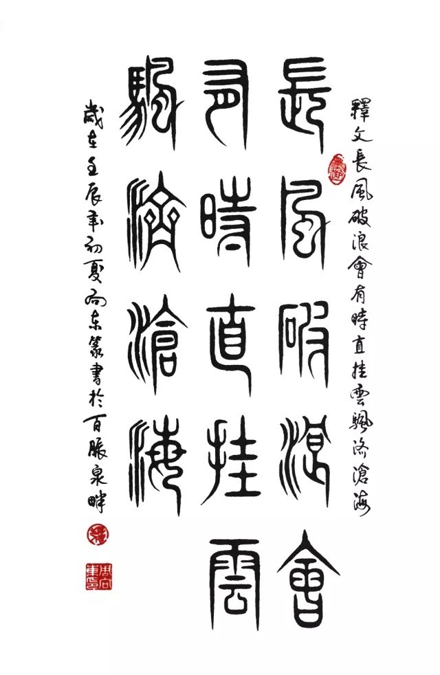 周向东自1963年研习书法起,几十年来笔耕不辍。他先后学习隶书、行书、金文和李阳冰小篆。他的篆书以隶笔写篆,既有李斯的端严又有李阳冰的流美,而后刚劲雄强。