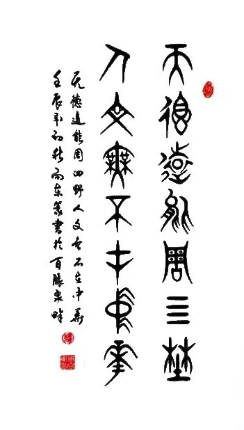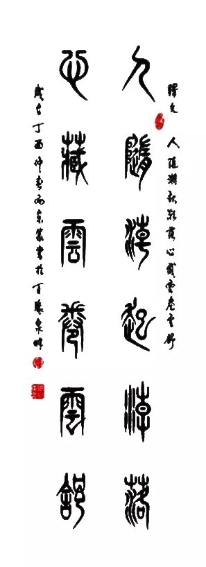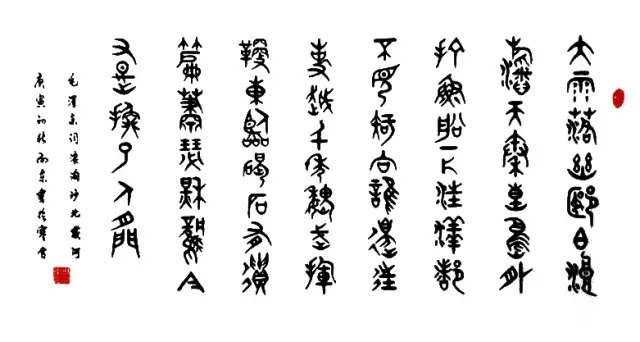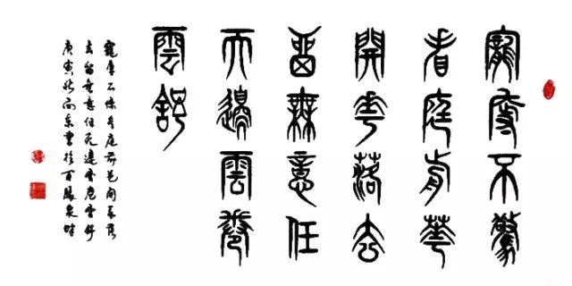 他的笔画屈曲回环,点画婉转冲融,圆活姿媚易取,结构圆劲遒密,劲利豪爽难得,变化开阖,龙蛇盘踞,饱含苍劲之力,雄浑之气,以庄严其容,壮大其势,有传承古代篆法的精神。