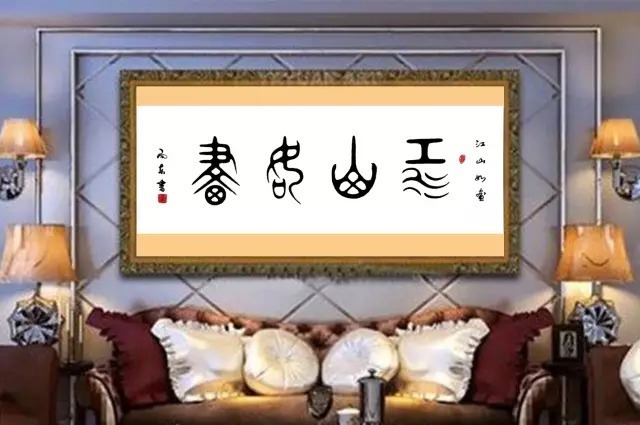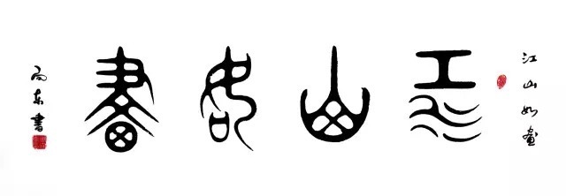 周向东的篆书横与竖等距平行,空间分割均衡与对称,字的局部对称,圆弧形笔画左右倾斜度对称。字体上紧下松,小篆大部分字主体在上部分,下部分是垂脚伸缩。若有无脚的字,主体笔画在下部,上部的笔画则可以耸起。