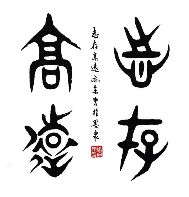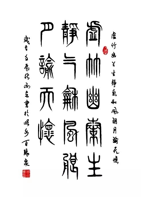 “笔不虚,则欠圆脱,妙在能合,神在能离,离合之间,神妙出焉。此虚实兼到之谓也”周向东书写篆书讲究中锋用笔,中锋立骨,笔画圆实劲健,运笔流畅。他捉笔以掌虚而指实,运笔讲求中含内敛、流畅通达,笔力藏于笔画之中,使气息首尾贯通。书作笔画虚实互出、润燥相生,宜圆转涩进,涩而通畅,节奏鲜明,韵律生动。
