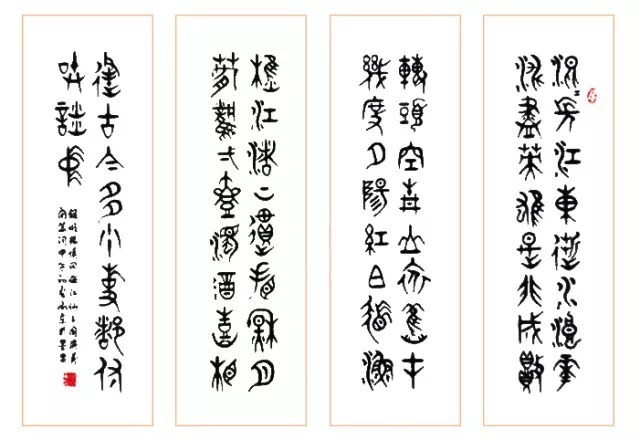 观周向东篆书,气势犀利,风骨遒劲,笔法雄健。那玉筋笔法,以瘦劲取胜,结体修长,线条遒劲平整,笔画从头至尾粗细一致,光滑洁净,婉曲翩然。