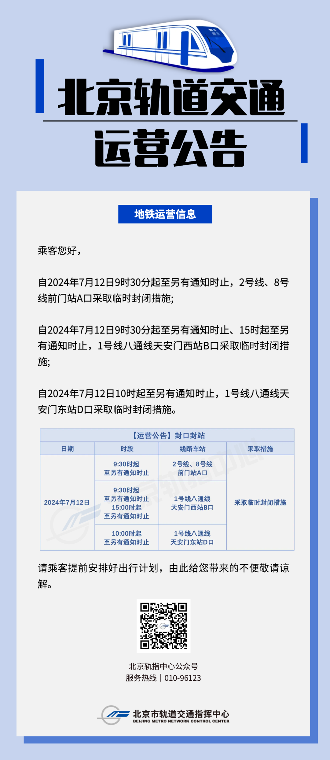 自2024年7月12日9时30分起至另有通知时止,前门站A口采取临时封闭措施。