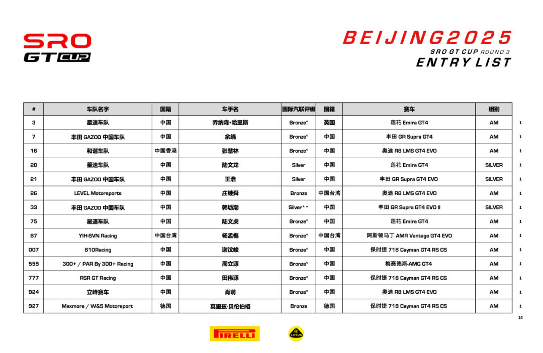 2025赛季SRO GT CUP第三站北京街道赛道参赛名单。