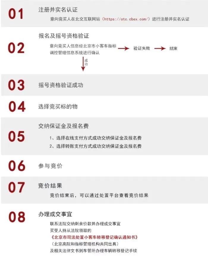 据介绍,在2023年01期(上半年)北京市小客车指标调控系统内审核通过但尚未中签的个人或符合报名条件的家庭主申请人在交纳保证金后,可报名参加竞买。按照规则成功竞买后,买受人根据要求履行完交齐成交价款等相关程序,可持北京高院和指标管理机构共同出具的《北京市司法处置小客车转移登记确认通知书》,在有效期内到公安机关交通管理部门办理转移登记手续,车辆原号牌号码不再保留。(来源:京法网事 责编:李丹)