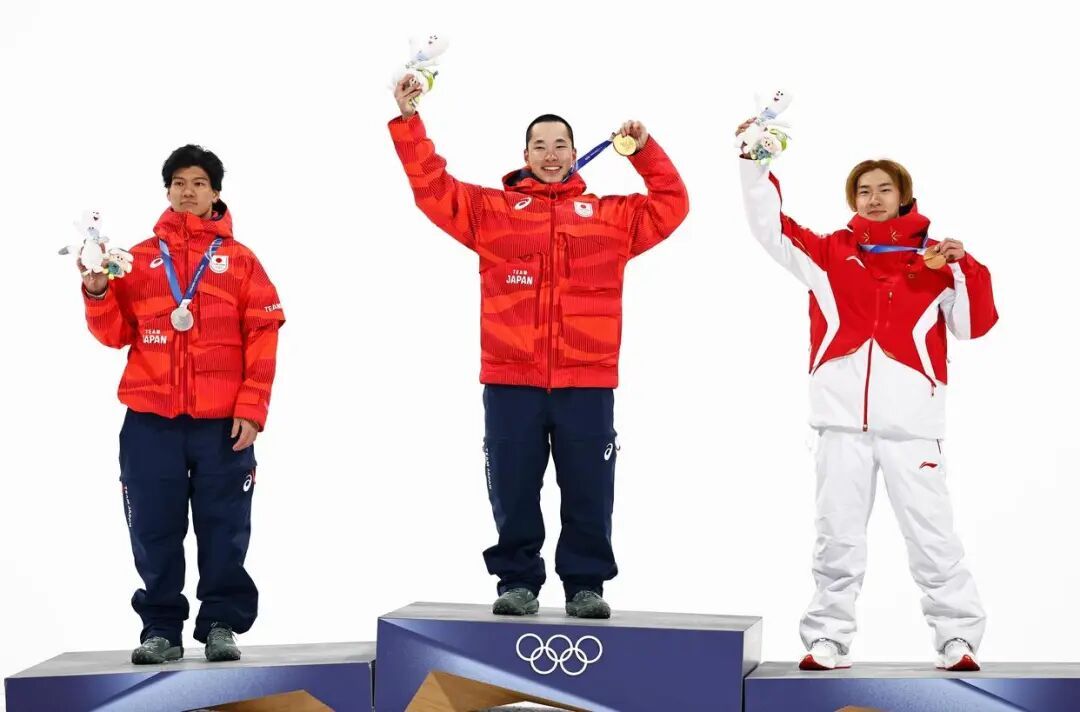 2月7日,冠军日本选手木村葵来(中)、亚军日本选手木俣椋真(左)和季军中国选手苏翊鸣在颁奖仪式上。