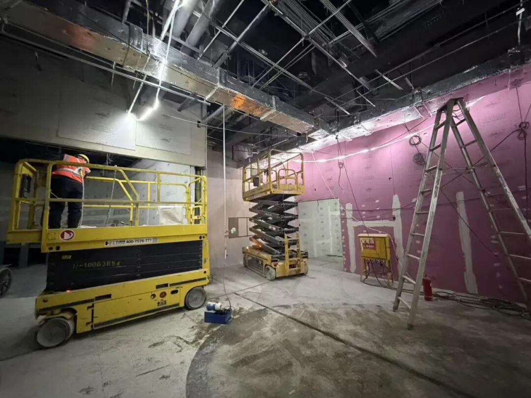 走进位于超极合生汇的中国(北京)航天科学中心的施工区域,现场一片繁忙景象。金属框架搭建起展厅的主体轮廓,纵横交错的管线有序排布,施工人员搭乘升降平台进行墙面与顶面的精细化作业,各类施工机具高效运转。