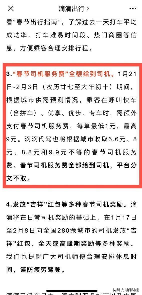 滴滴出行回复时间财经称,1月21日-2月3日(农历廿七至大年初十)期间,滴滴根据城市供需预测情况,乘客在呼叫快车(含拼车)、优享、优步、专车时,需额外支付春节司机服务费。滴滴代驾也将根据城市收取不等的春节司机服务费。春节司机服务费全部给到司机,平台分文不取。