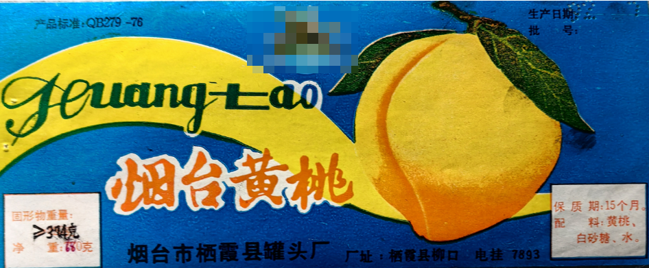 下面这张烟台市栖霞县(现栖霞市)罐头厂的黄桃罐头瓶贴,距今已有34年——