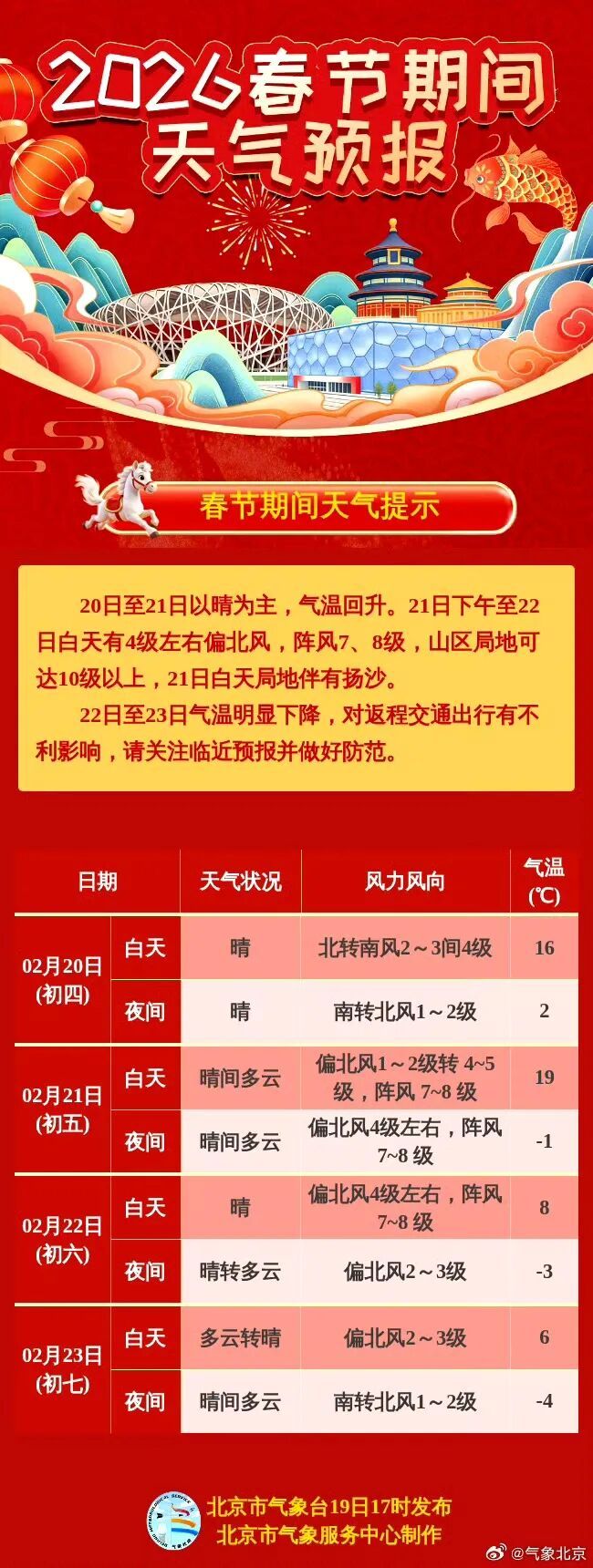@气象北京17:54发布:20日至21日北京以晴为主,气温回升。21日下午至22日白天有4级左右偏北风,阵风7、8级,山区局地可达10级以上,21日白天局地伴有扬沙。22日至23日气温明显下降,对返程交通出行有不利影响,请关注临近预报并做好防范。