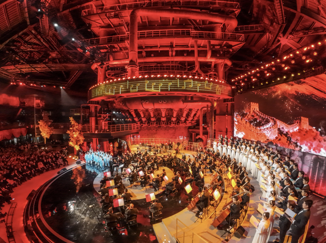 19时30分,西山脚下、永定河畔,首钢园三高炉披上绚丽光影,一场多元跨界的沉浸式音乐会拉开序幕。音乐会以“山河永定·家国长安”为总纲,分为“红色追忆”与“多彩未来”上下两篇,用旋律串联起民族精神的传承与时代发展的脉动。