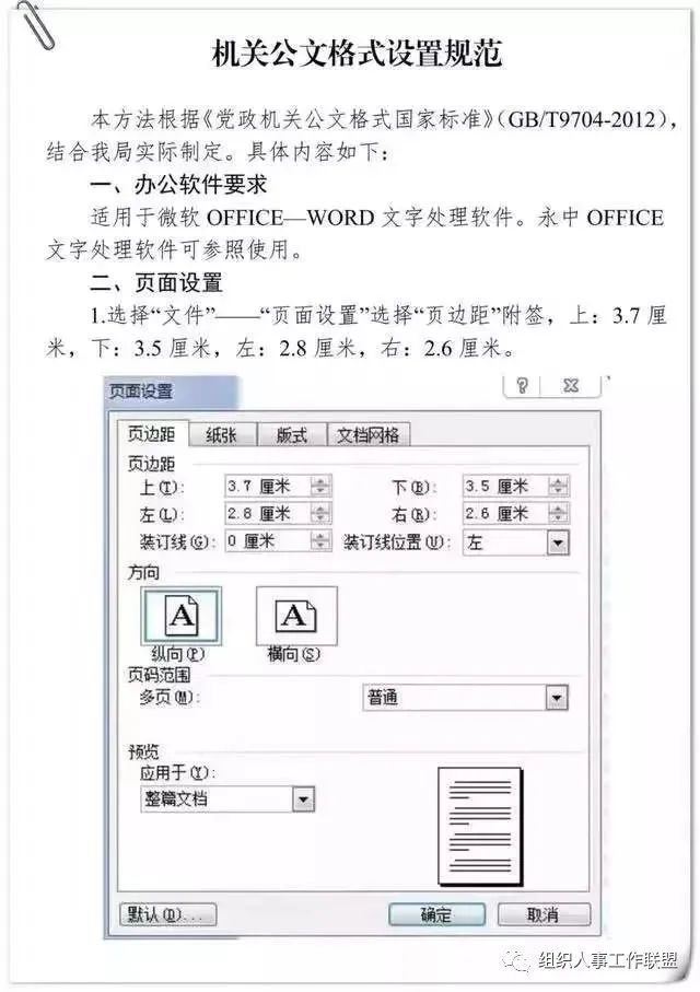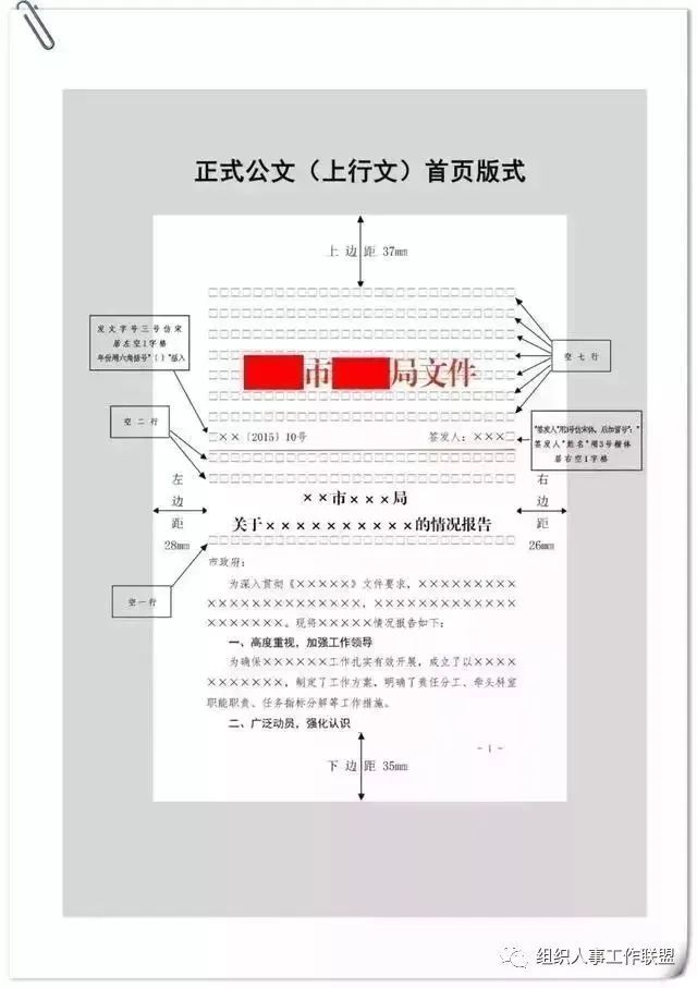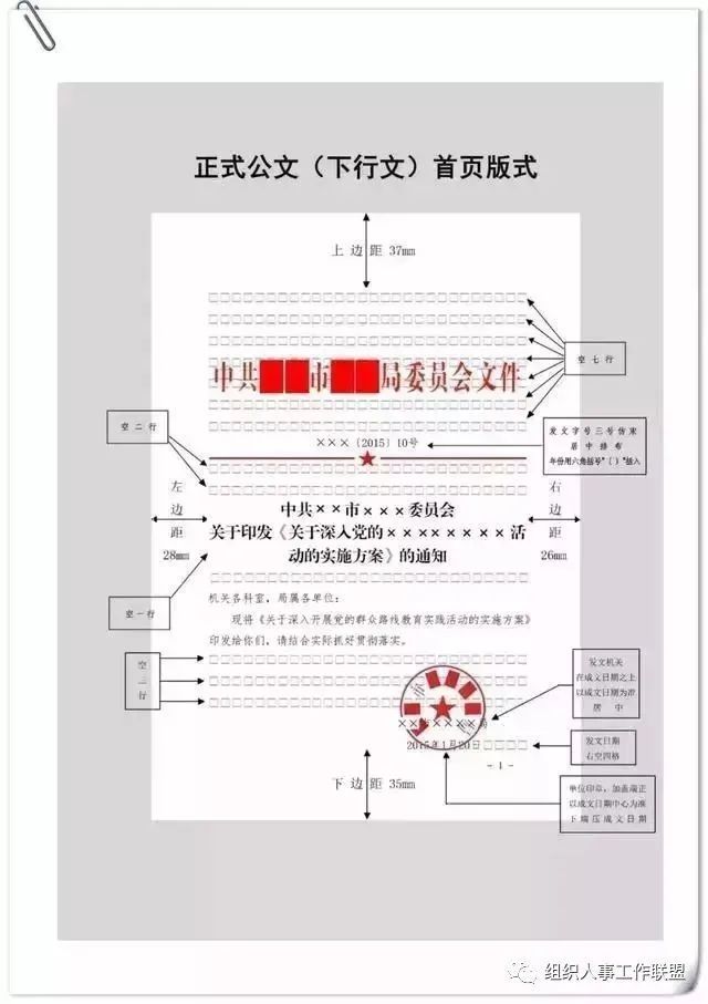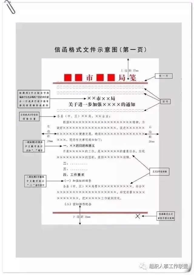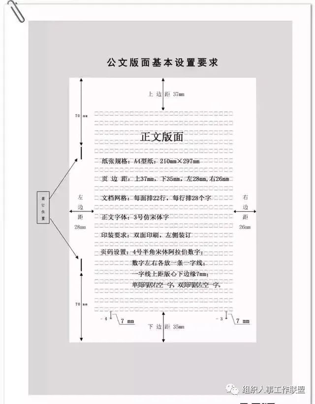 公文用纸天头(上白边)为37 mm±1 mm,订口(左白边)为28mm±1mm,版心尺寸为156 mm×225 mm。