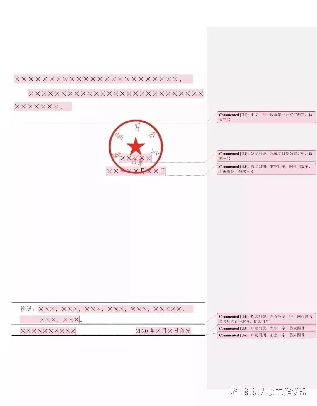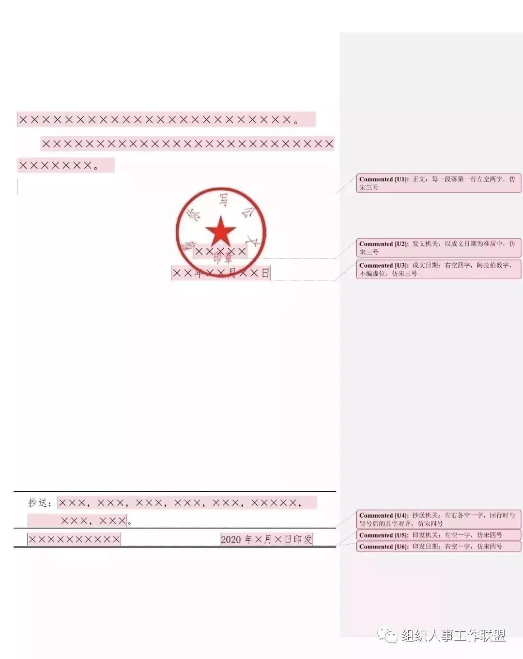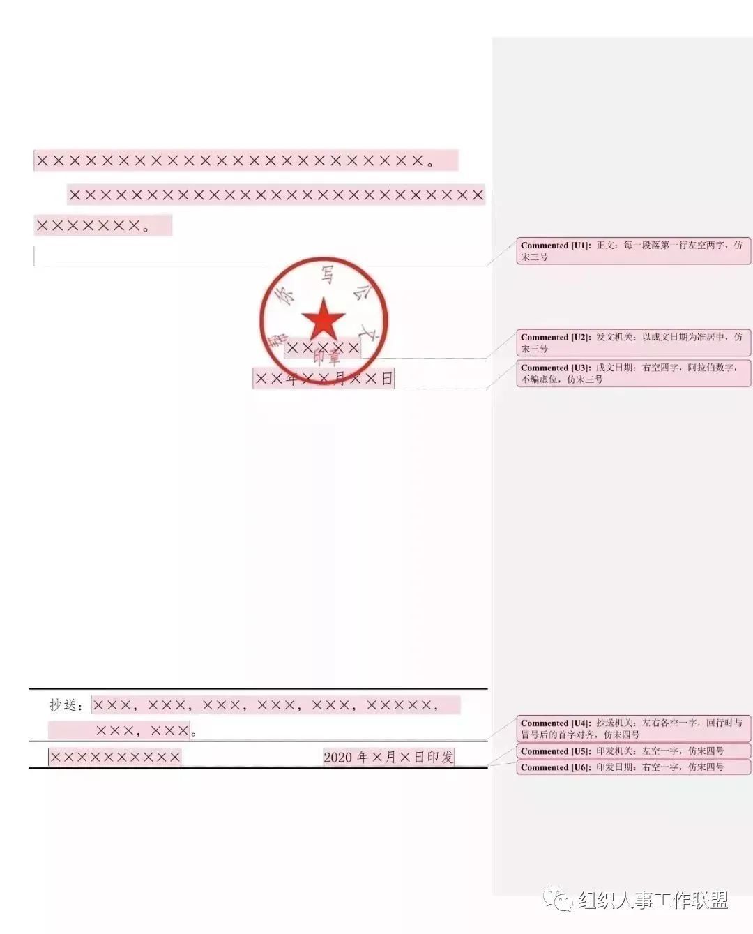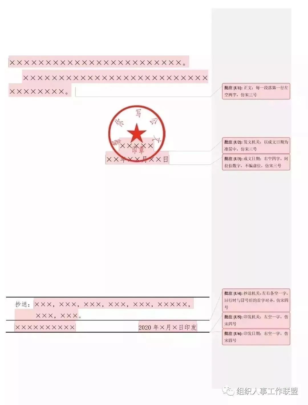 成文日期一般右空四字编排,印章用红色,不得出现空白印章。