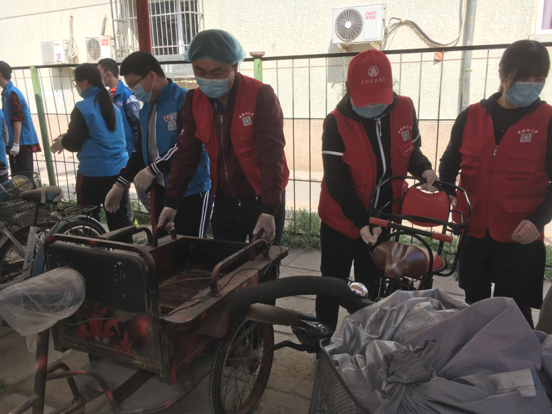 ▲志愿者将新安巷东侧自行车棚杂物全部清理