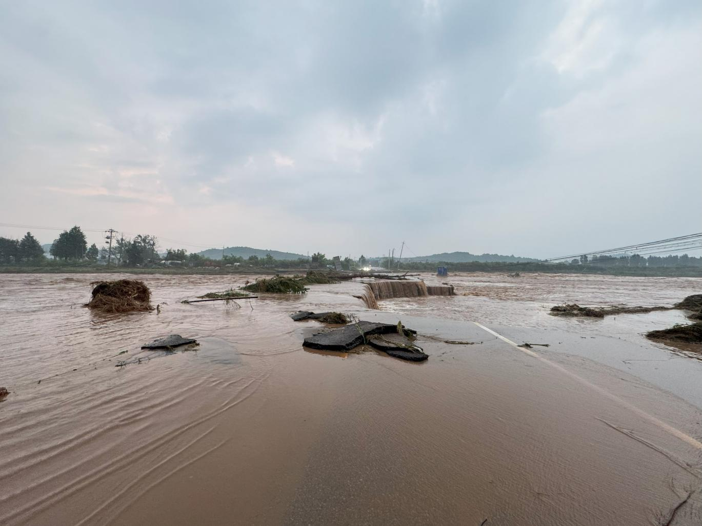 在持续强降雨的猛烈冲刷下,不老屯中心小学往东400米处的主要道路受洪水冲击,一段路基轰然塌陷,形成了一个触目惊心的大缺口,前方四百米遍地水流,交通瞬间中断,更潜藏着巨大的安全隐患。5名青年突击队员闻令而动,第一时间顶风冒雨毅然承担起守护安全的第一道防线。整整12个小时,他们如同矗立在险境前的“人墙”,用责任和毅力成功劝返试图通行的各类车辆100余辆、行人300余人次。