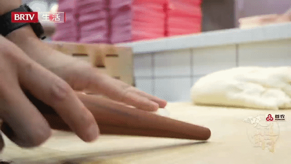 打馍是制作白吉馍的关键步骤,打的快慢和节奏,全凭师傅的个人习惯。面杖的快速移动和变换方向,可以在面团表面形成自然的层次感,这是馍酥脆口感的重要来源。上下飞舞的面杖,是师傅技艺的展示,与面案的碰撞声,也是吸引食客的一种方式。现打的馍才会有麦香气和酥脆感,这是现打手工馍和预制馍的区别。店里有三位打馍的师傅,平时每天要打1000多个馍,周末要打2000多个,最高记录一位师傅一天做了一千多个馍。