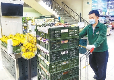 西城区首航超市20西便门店,工作人员正在上货。超市从货源组织、源头供货、安全运输等一系列措施确保必需品的供应充足。北京晚报记者方非 摄