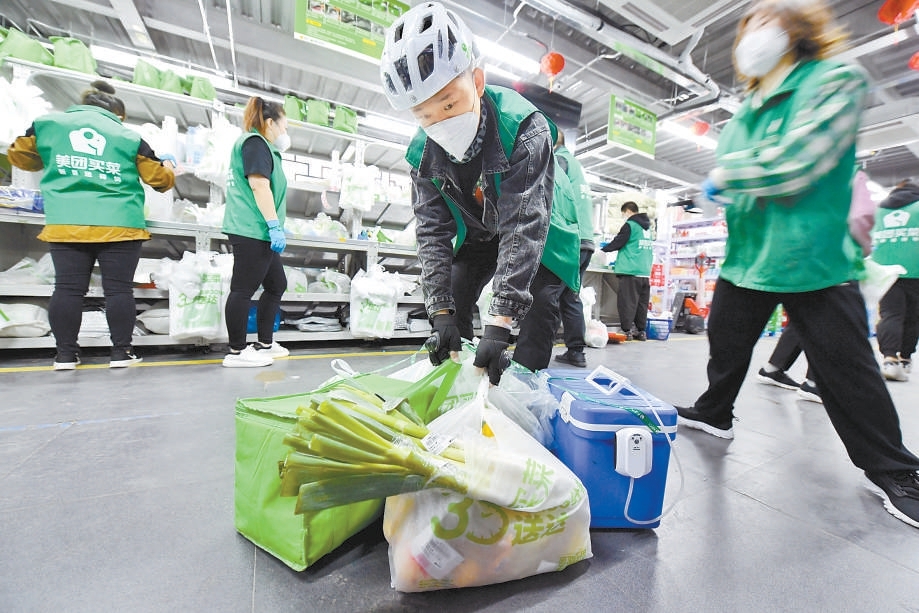 在美团买菜东城彭庄站,分拣、打包、配送工作从6点半就开始进行,保障市民全天生鲜食品供应。北京晚报记者 邓伟 摄