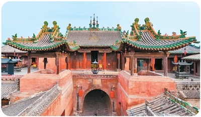 空王行祠位于张壁古堡北部,其殿顶上的琉璃构件均施以黄、绿、孔雀蓝釉,其中,孔雀蓝色泽最为纯正,仿佛采湖水之色,凝碧空之韵。脊瓴上雕有游龙翔凤、雷公和牡丹枝蔓,顶部站立的琉璃武士怒目嗔视。大殿廊下,东西各立有一块琉璃碑,碑帽为二龙戏珠图案,碑身通体施以孔雀蓝釉,堪称琉璃珍品。