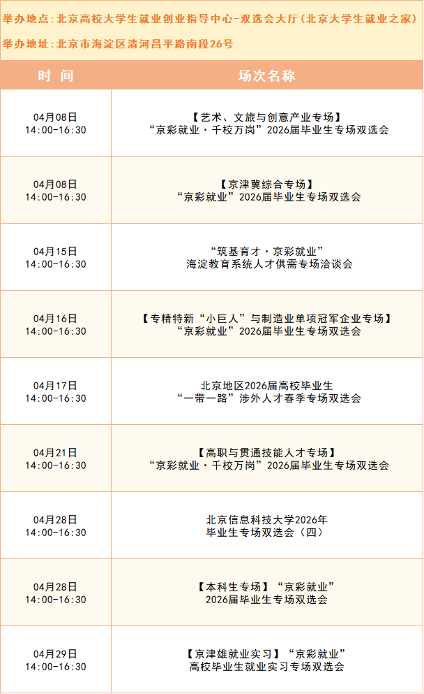 近日,北京高校大学生就业创业指导中心发布4月双选会日历,2026届高校毕业生可浏览下方长图了解具体安排。