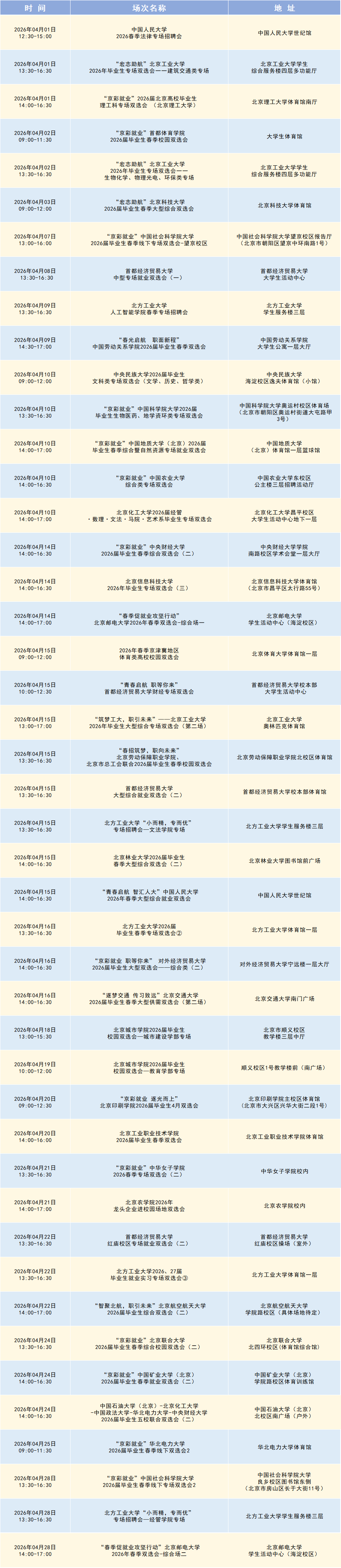 *双选会场次持续增加中,请登录北京高校大学生就业创业信息网(https://www.bjbys.net.cn/)查看并提前预约报名参会。双选会场次安排请以系统内显示为准。