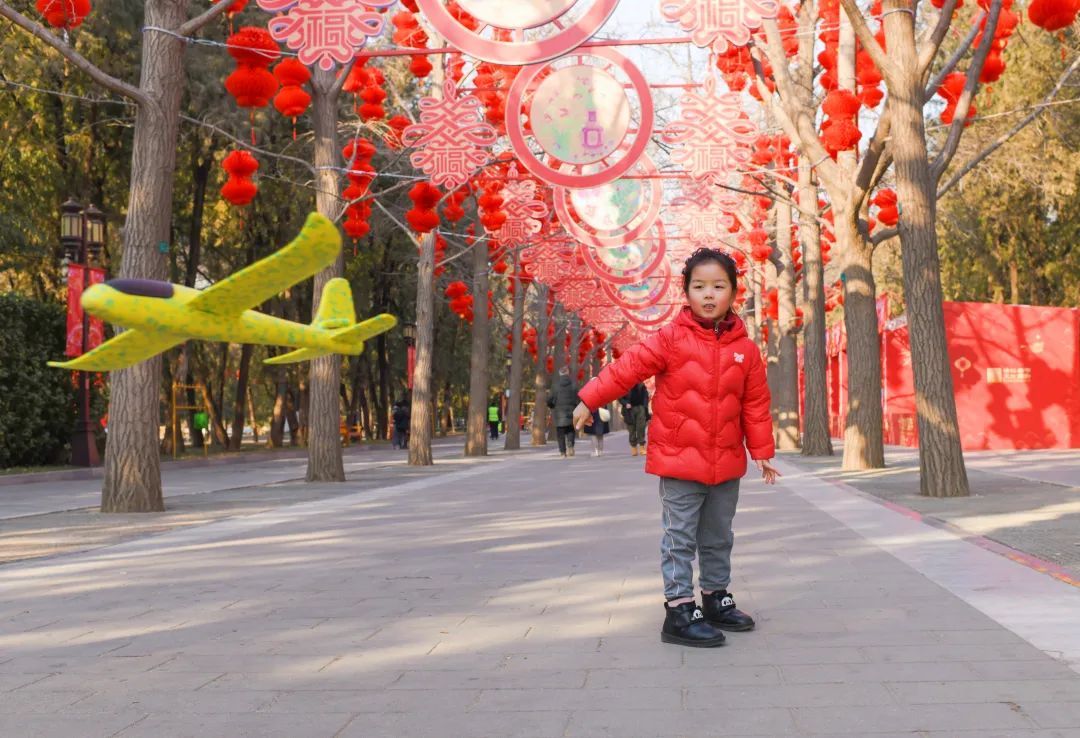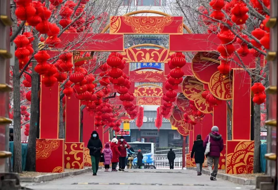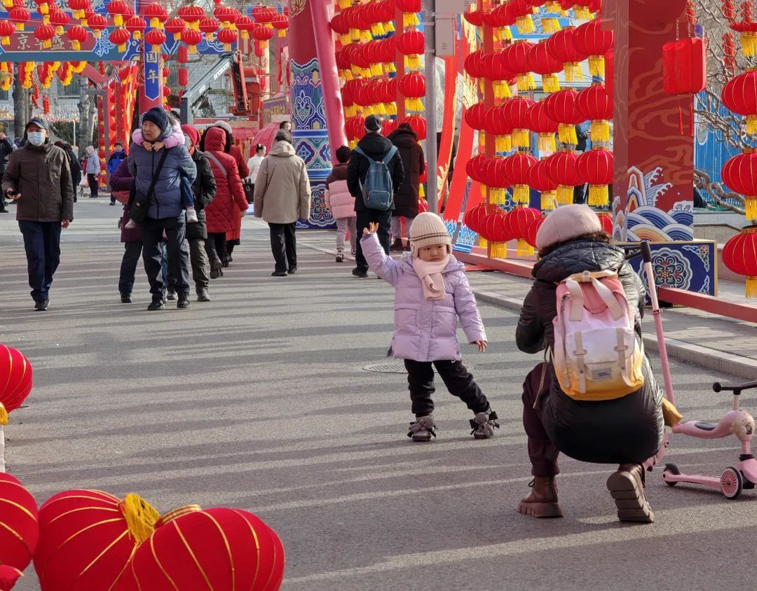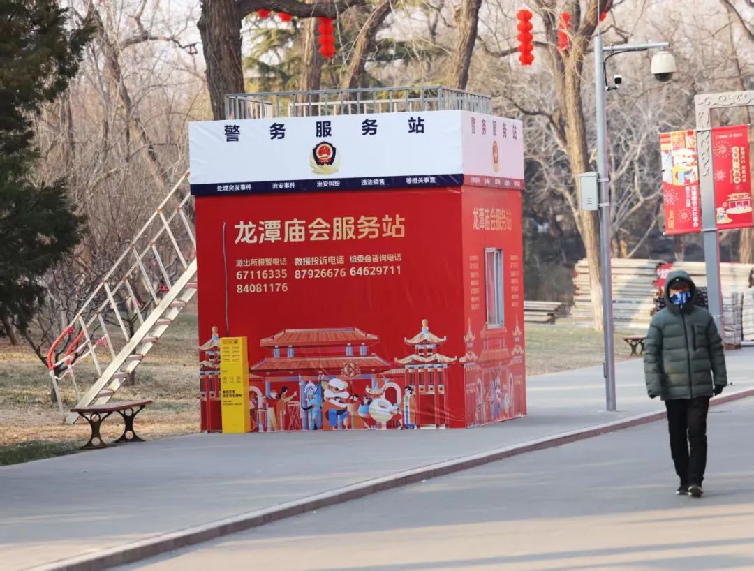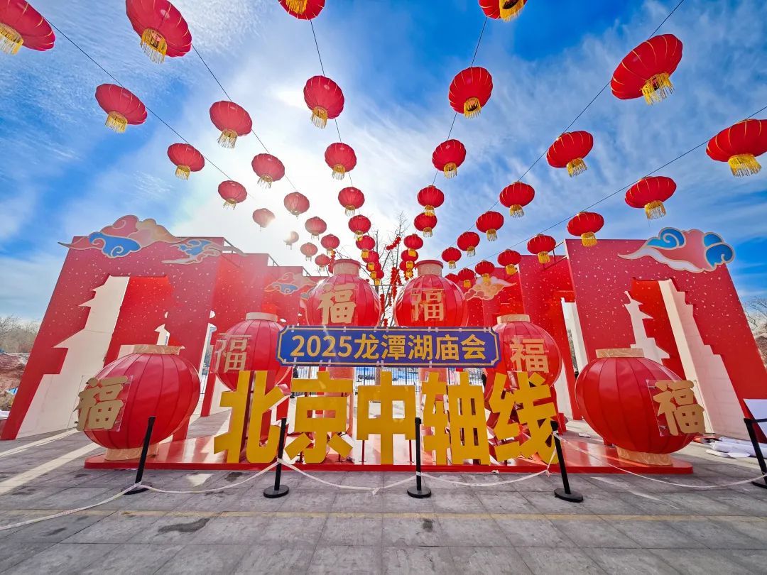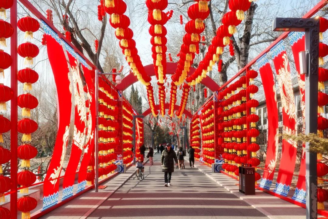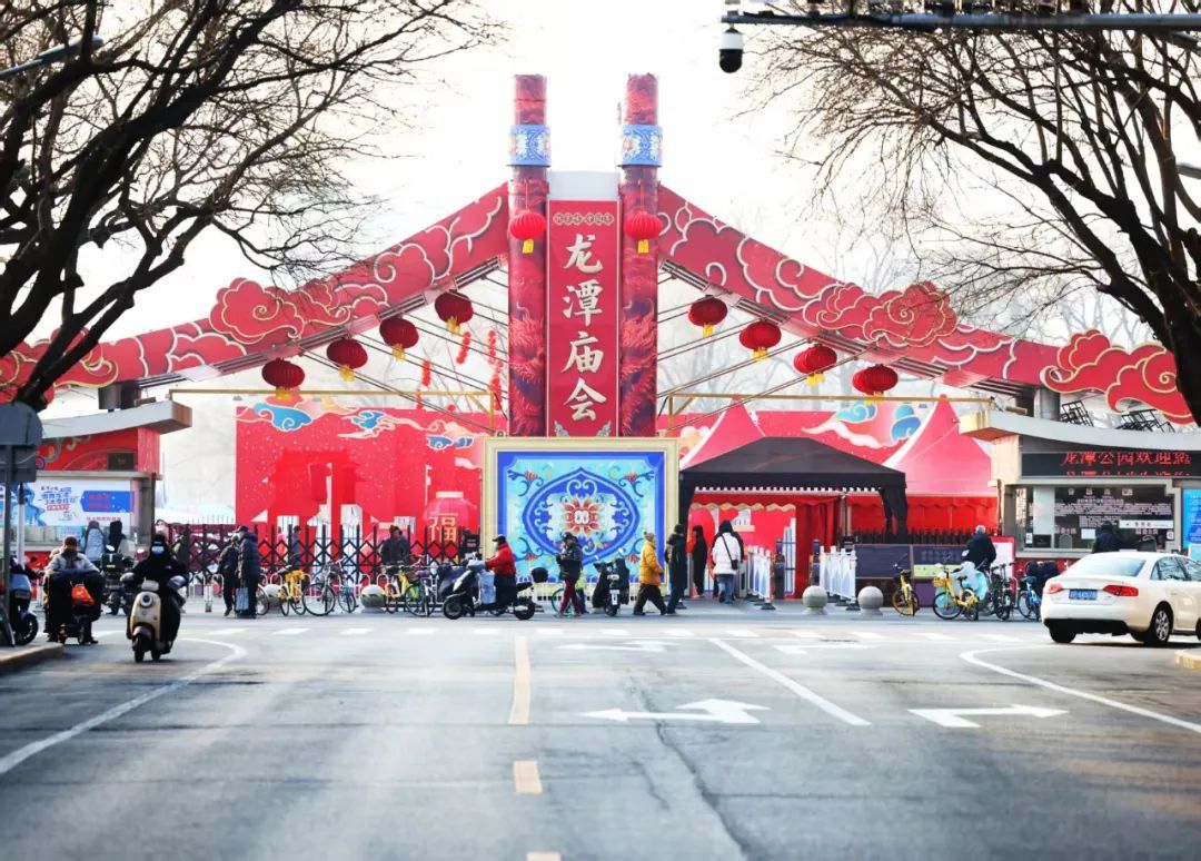 龙潭公园同样装饰一新,四个门区大红灯笼和中国结高高挂起,“燕京八绝”非遗技艺巧妙地运用在装饰里,为即将到来的庙会增添了浓厚的节日氛围。