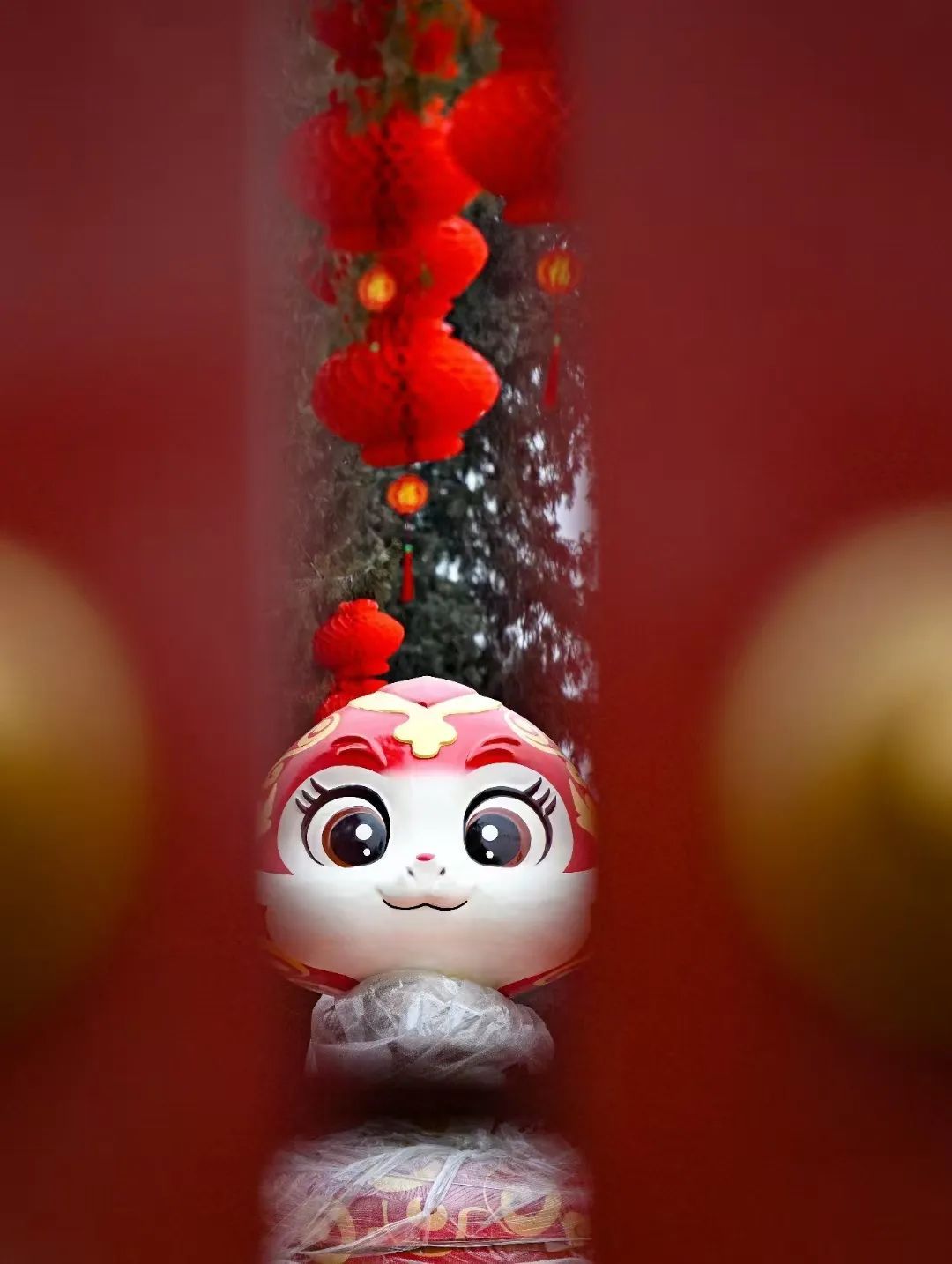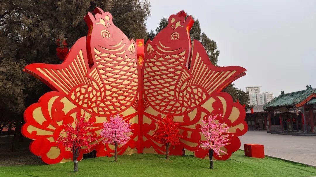 穿过牌楼往里走,大红灯笼、大鲤鱼、福字等各式装饰将年味儿拉满。整个公园内的装饰色调以代表中国年节色彩的红、黄色为基调,营造地坛庙会雍容大气的皇家年节气氛。