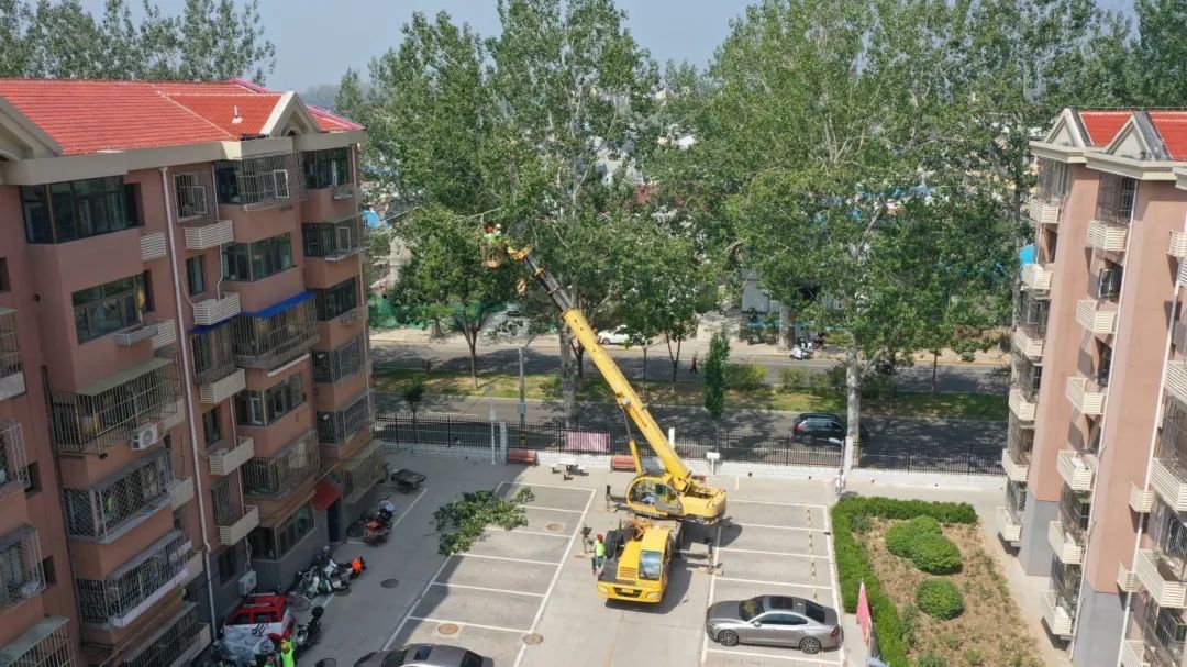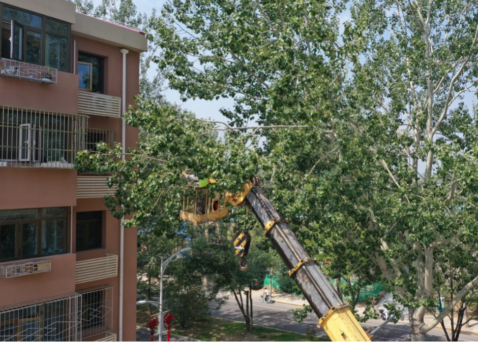 前些时,记者在温泉南区西里社区看到,北京夏都园林绿化有限公司的工作人员操控工程作业车,对11号楼旁的大杨树进行精准修剪,居委会工作人员则有序引导居民疏散,确保作业安全。