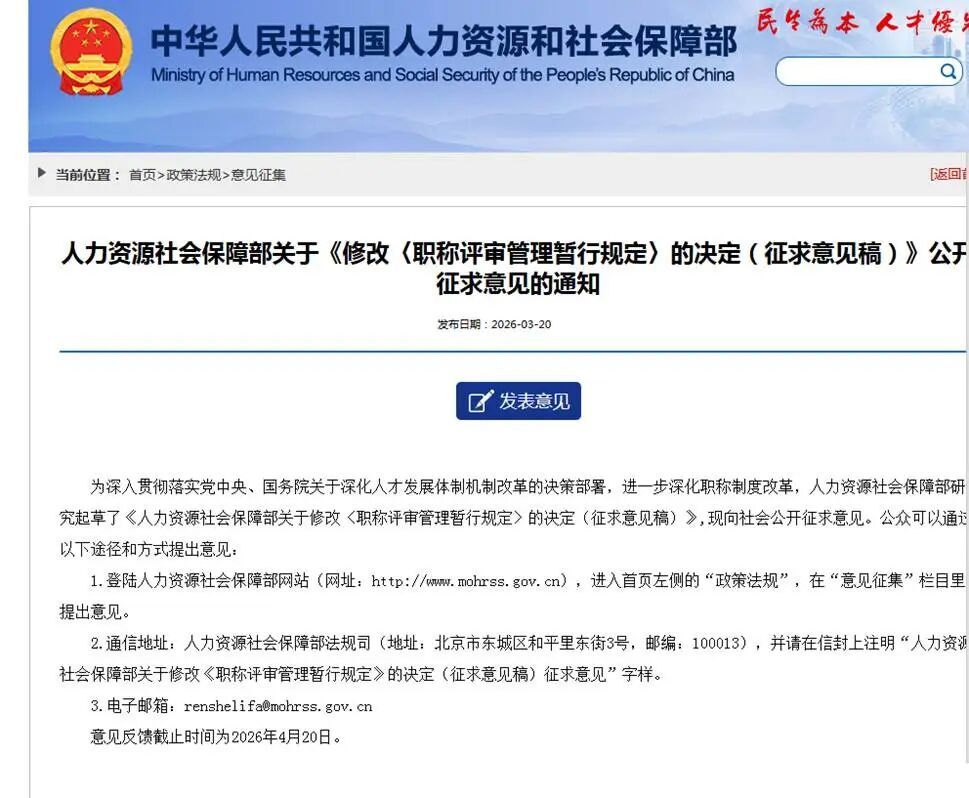 近日,人力资源和社会保障部研究起草了《人力资源社会保障部关于修改〈职称评审管理暂行规定〉的决定(征求意见稿)》(以下简称《征求意见稿》),正在向社会公开征求意见,意见反馈截止时间为2026年4月20日。