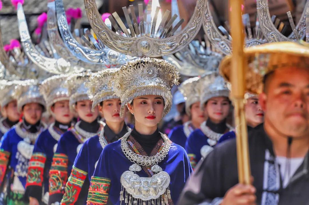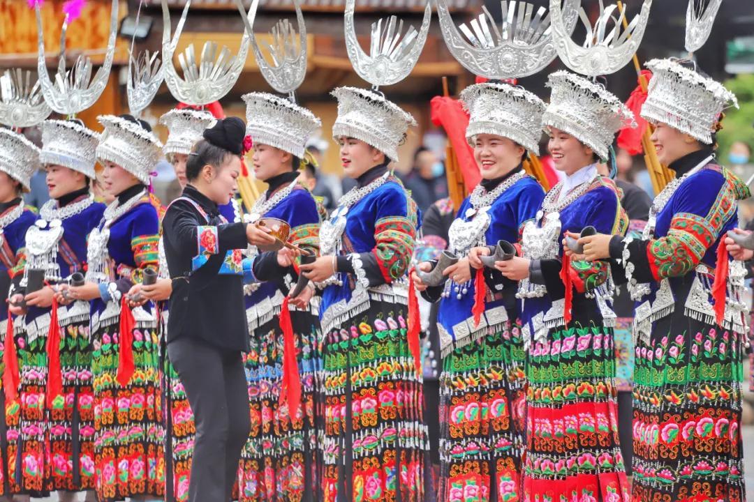 酒客还没把酒言欢、意犹未尽、不会被扫兴,为欢迎贵客牛角酒杯已高高悬赏于寨门口,银装素裹的姑娘们正双手捧杯,杯中装满米酒、分立两旁迎接贵宾,伴着芦笛、芒筒的喜庆乐章,正式开启传统的迎客拦门酒礼仪,十二道拦路酒静候驾临。