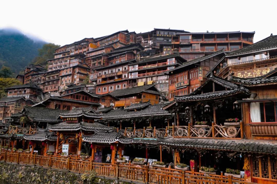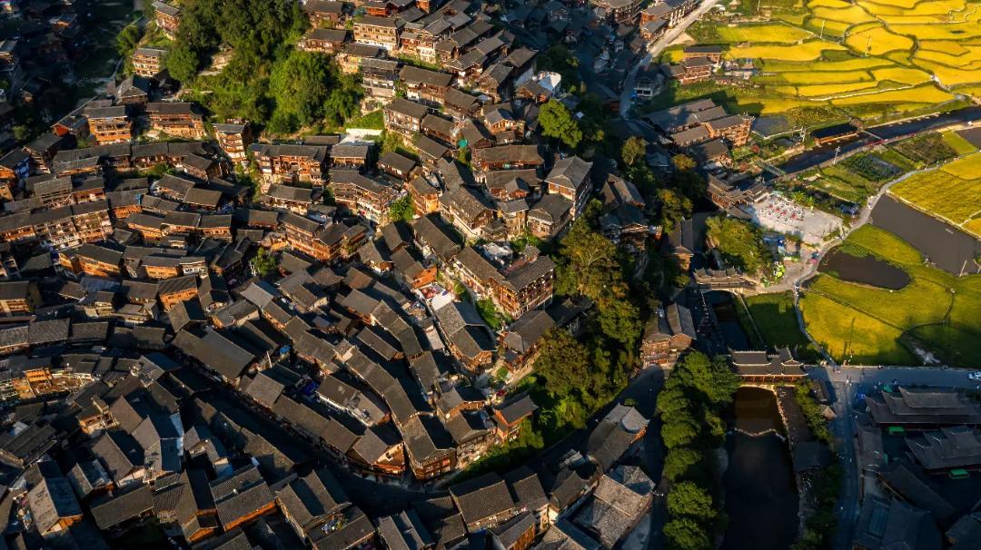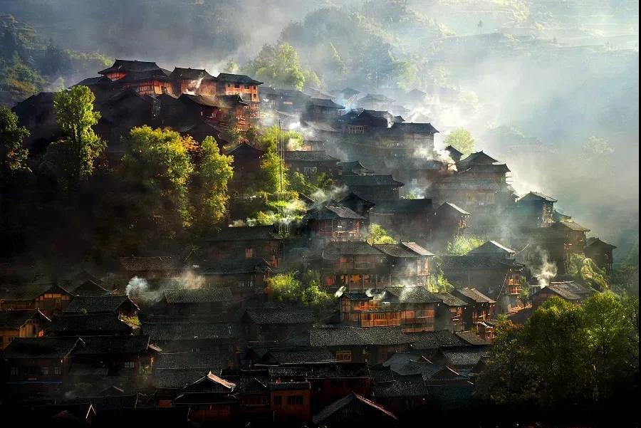 仿佛徜徉在梦里的仙境,幽幽古树环山参天,河流潺潺蜿蜒,漫步在横亘的雨桥上、远眺梯田,夕阳洒在茂盛的谷道上,蓊郁的屏风守护着岁月静好的世外桃源,勾勒出苗岭的山水田园。