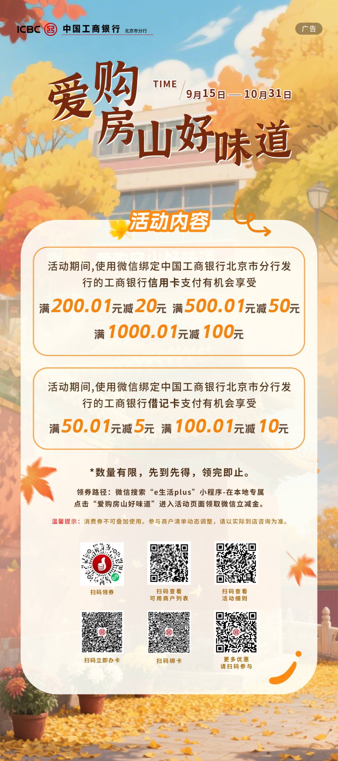 通过微信绑定工行北京地区信用卡在指定商户支付,可享满1000.01元减100元、满500.01元减50元、满200.01元减20元优惠;通过微信绑定工行北京地区借记卡在指定商户支付,可享满100.01元减10元、满50.01元减5元优惠。活动时间为2025年9月15日至2025年10月31日,活动名额有限,先到先得。