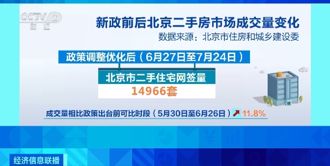 首付利率下调、“以旧换新”活动推出,同时带动了新房和二手房交易。数据显示,政策调整优化后,6月27日至7月24日北京市二手住宅网签量为14966套,成交量相比政策出台前可比时段(5月30日至6月26日)增长11.8%。“以旧换新”活动启动一周来,近万名购房人浏览活动线上页面,已有378组客户报名参加“以旧换新”。